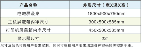 由三个屏蔽箱体组成,上边带有屏蔽玻璃的屏蔽箱用于放置显示器,左右两边分别放置主机、打印机、传真机等。在左边屏蔽箱体有USB接口滤波器,用于连接键盘和鼠标,在左边主机箱体内有电源滤波器,全桌电源都由这个电源滤波器供应。